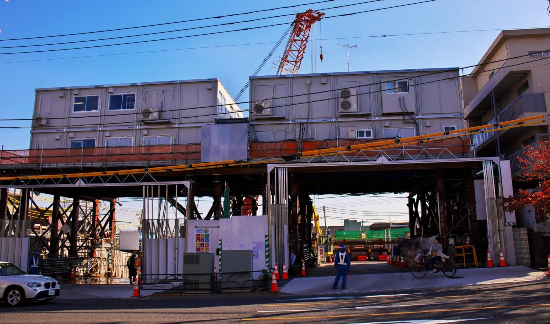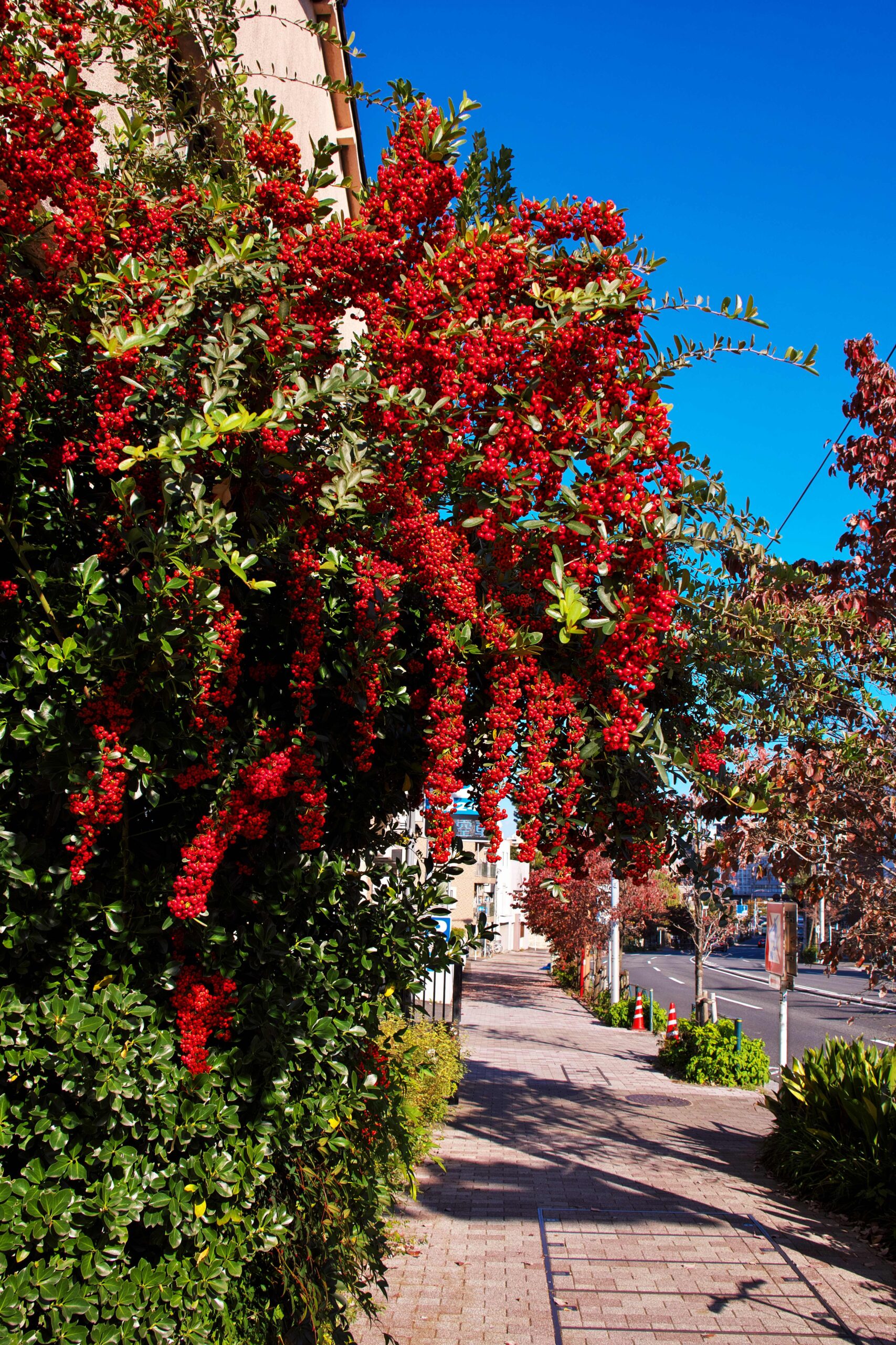 試しに、防犯パトロールではあまり見ることのない中原街道沿いの今日の風景を添付します。安藤モーター横の見事なピラカンサスとJRリニアの車両搬入(右手)、搬出(左手)ゲートの写真です。